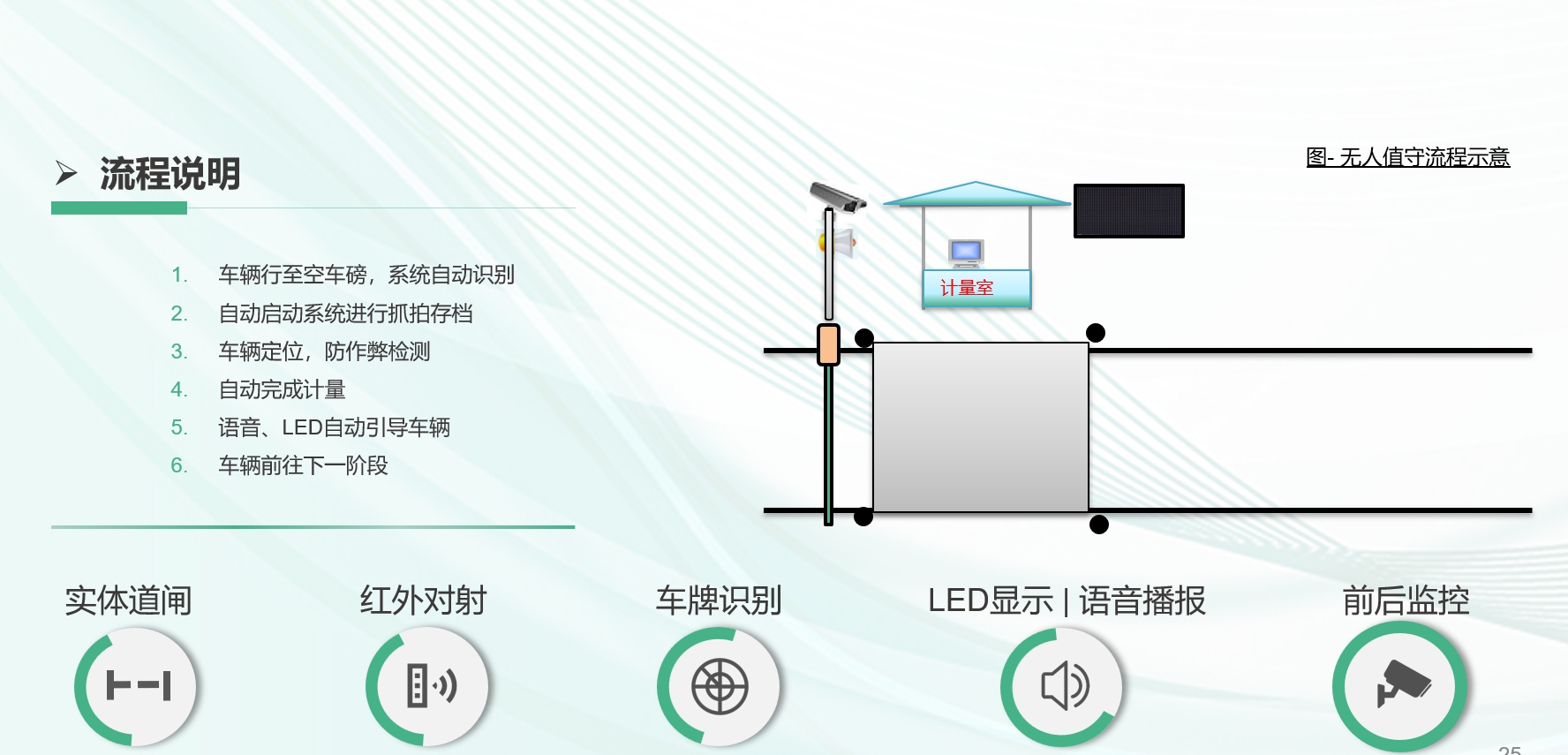 - 紅(hóng)外(wài)驗證系統:紅(hóng)外(wài)設備自(zì)動驗證車€ ✘(chē)輛(liàng)是(shì)否完全上(shàng)磅,防止車α↓∞>(chē)輛(liàng)壓磅作(zuò)弊。